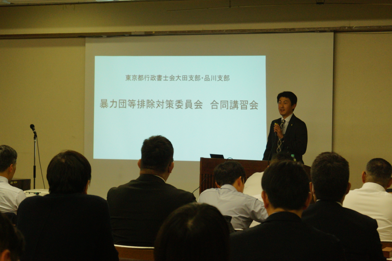 大田区管内の4警察署(蒲田、大森、田園調布、池上)と、品川区管内の4警察署(品川、荏原、大崎、大井)より合計15名のご参加をいただき、東京都行政書士会の雨谷幹彦副会長、東京都行政書士会暴力団等排除対策委員会の石田裕子委員長、榎本吉男副委員長、大田支部会員44名、品川支部会員14名、他支部会員1名を含め、計77名の研修会となりました。冒頭に品川支部の長谷部博昭支部長の挨拶に続き、雨谷幹彦副会長、石田委員長より、暴力団等排除対策研修会の必要性などのお話をいただきました。各署ご担当者紹介の後、蒲田警察署、荏原警察署の各刑事組織犯罪対策担当者より、それぞれ最近の暴力団等反社会的勢力の現状についてお話をいただきました。続いて、大田支部の長野元祐会員(前区議会議員)が、“「汝の敵を知れ」反社対応の心構え”をテーマに区議会議員3期の経験をもとに講義をされました。各会員からの質疑応答の後、恒例の暴力団排除宣言を行い、大田支部の西坂洋平支部長の謝辞により閉会しました。研修終了後の懇親会には、多数の方にご参加いただきました。警察署の皆様、来賓の皆様、会員同士の意見交流などが闊達に行われ、大変充実した研修会となりました。